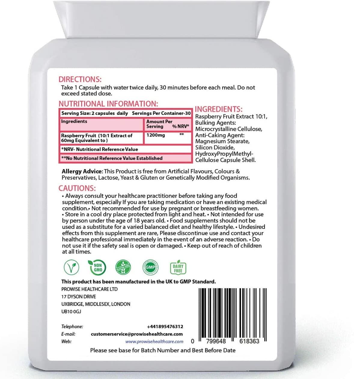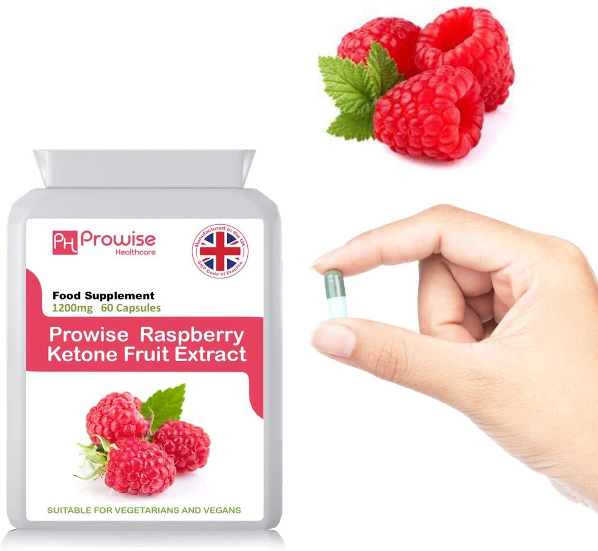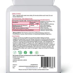 Raspberry Ketone is a natural phenolic compound that helps create the distinct aroma of red raspberries. Raspberry Ketone prevents and improves obesity and fatty liver and encourages both the expression and secretion of adiponectin.Adiponectin is a protein hormone which modulates several metabolic processes, such as glucose regulation and fatty acid catabolism. Prior research of adiponectin have concluded that your levels of adiponectin are inversely correlated with your body fat percentage; the higher your adiponectin the lower your body fat.Healthy levels of adiponection have also been shown to control the metabolic derangements that may lead to type 2 diabetes, obesity, atherosclerosis, non-alcoholic fatty liver disease and metabolic syndrome. Unsurprisingly this led the researchers to conclude that Raspberry Ketone holds great promise as a fat-burning, health-supporting herbal supplement. KEY BENEFITS:High Strength, 600mg Raspberry Ketone. May support increased fat metabolismEffective weight management supplementOnly premium high grade natural ingredientsSuitable for vegetarians and vegansManufactured in the UK to GMP code of practice